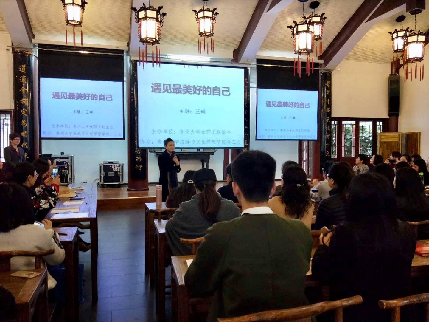 11月18日上午,校工会女职工联谊会在贵州大学中国文化书院勉学堂举办了主题为“遇见最美好的自己---仪态礼仪讲座”。本次讲座女职工联谊会特邀请中华教育艺术家协会理事、专业人才教育专家委员会礼仪委员、全国专业人才教育工作部广西培训中心主任、 贵州大学旅游与文化产业学院讲座教授王琳老师,从礼仪的六大特性到九德、九容,从礼宾接待到行为训练等展开了生动形象的讲授,内容丰富,形式多样,对大家提高个人修养,提升我校教职工的仪表礼仪和行为素质提供了很好的帮助和启示,为我校文明校园建设增添了更多的风采,共60余人参加了本次讲座。