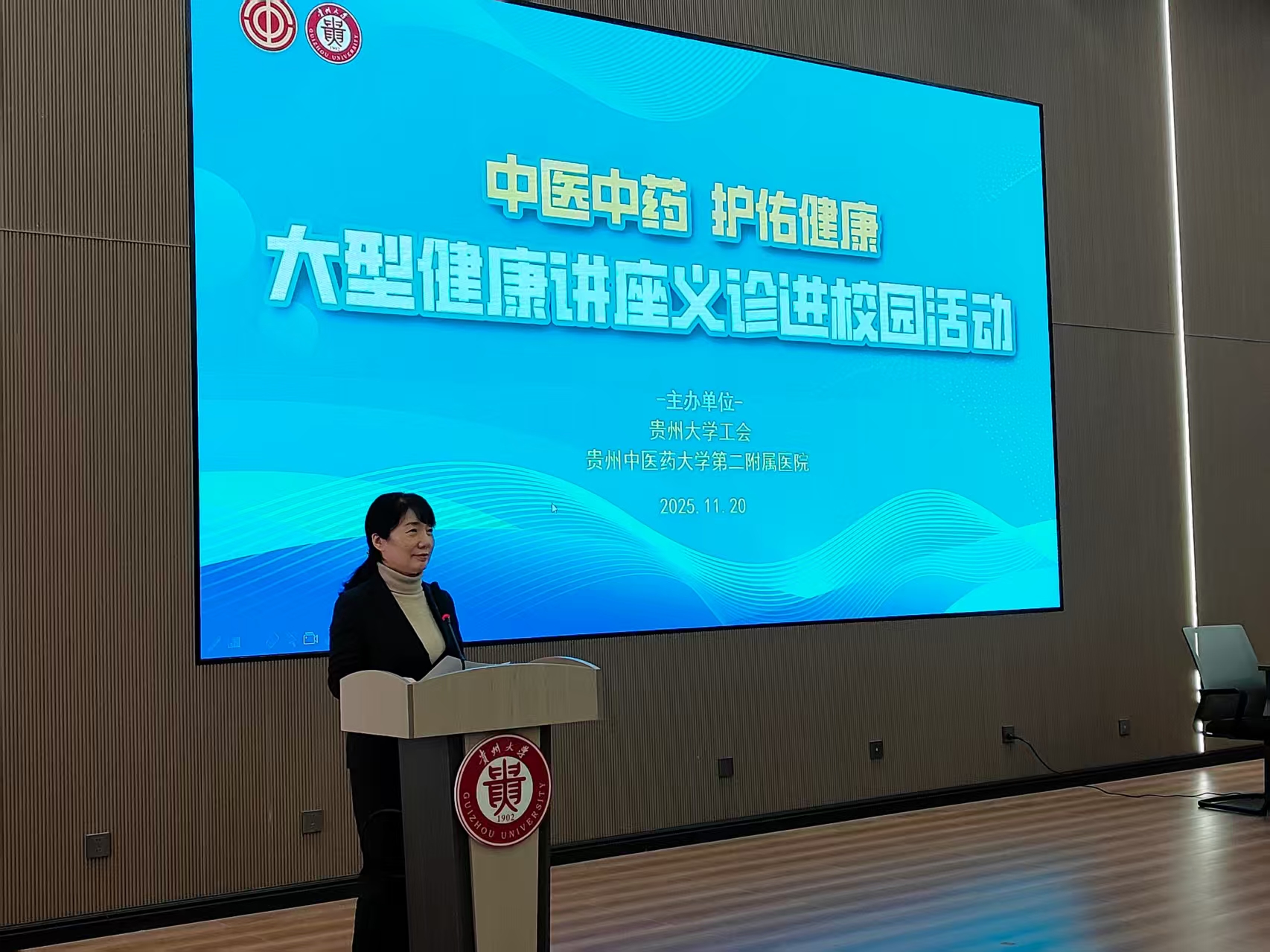 为深入弘扬中医药文化,推进“健康进校园”工作走深走实,提升我校师生的健康素养与自我保健能力,2025年11月20日下午,由贵州大学工会主办的“中医中药 护佑健康”大型健康讲座及义诊进校园活动在贵州大学西校区德正楼成功举行。本次活动邀请了贵州中医药大学第二附属医院数名医护专家。