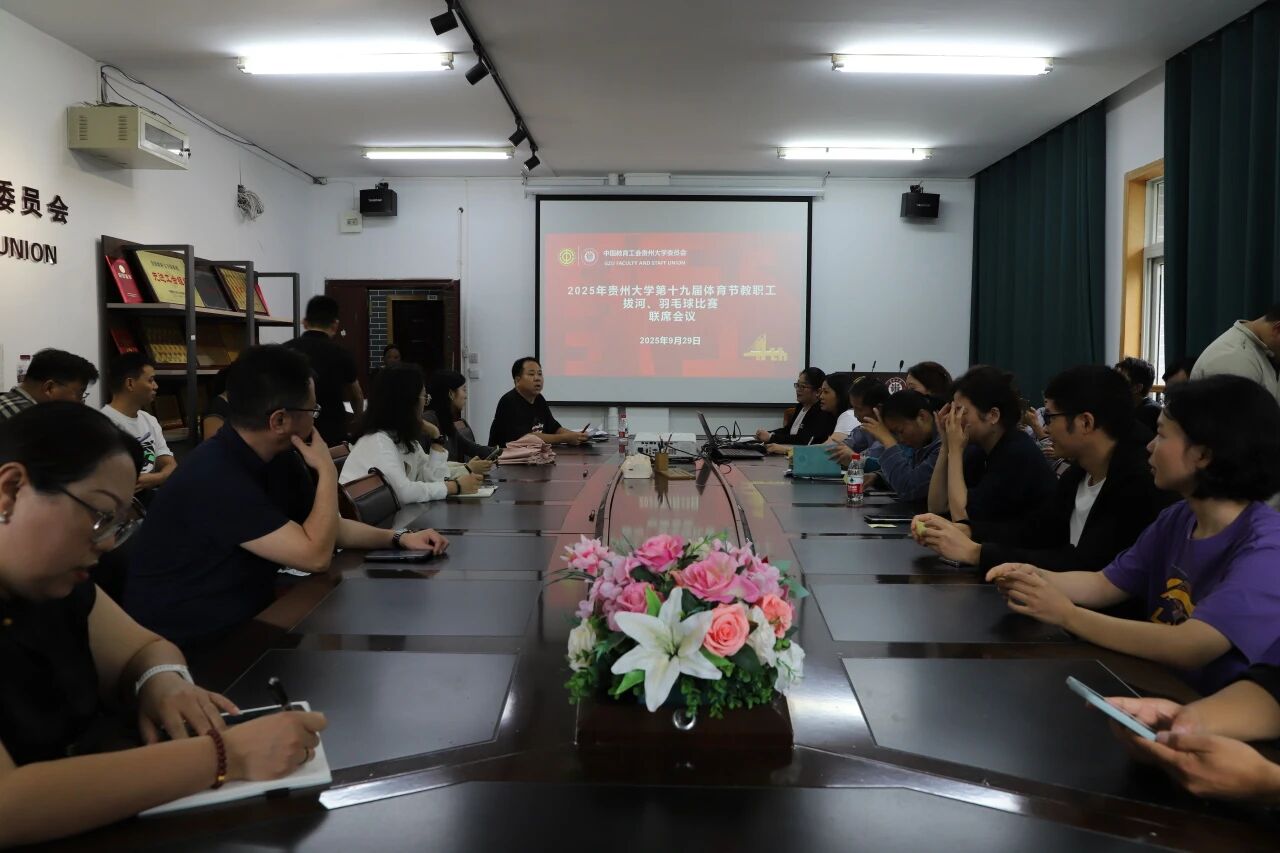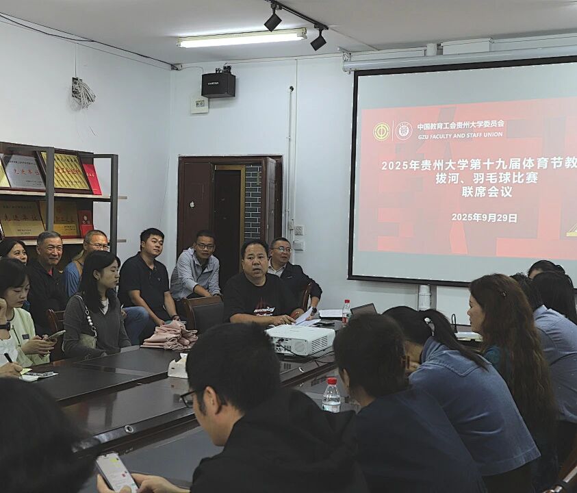 2025年9月29日13时,贵州大学第十九届体育节教职工拔河、羽毛球比赛联席会议在校工会303会议室顺利召开。会议由贵州大学工会副主席(代)吴卫同志主持,各分工会代表参加会议。本次体育节共有拔河参赛队34支、羽毛球参赛队26支,人数达800余人。