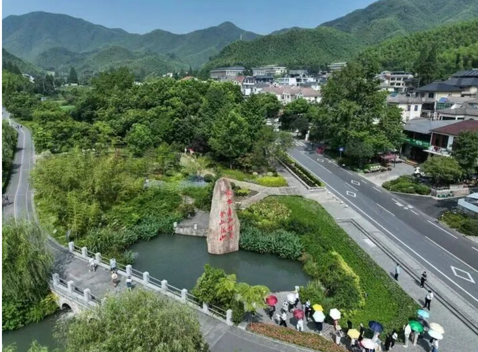 2023年8月11日,游客在浙江安吉余村参观(无人机照片)。新华社记者 翁忻旸 摄