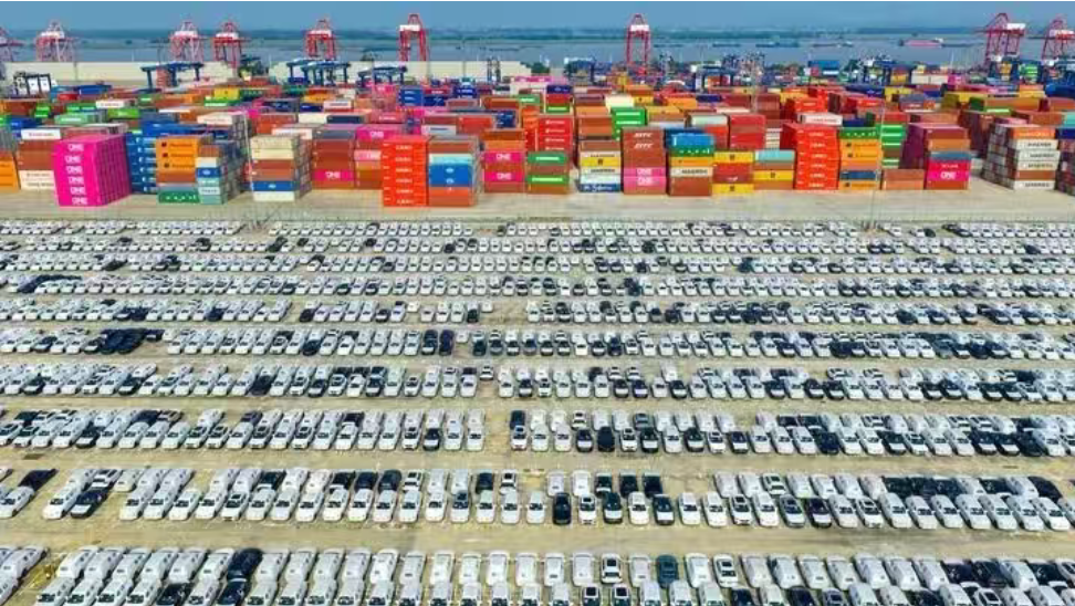 2025年10月4日在江苏省港口集团南京港龙潭港区拍摄的准备装船出口的汽车(无人机照片)。新华社发(杨素平摄)